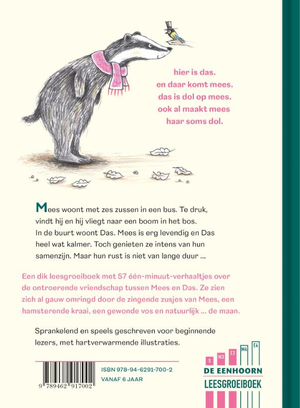 » Leesgroeiboek voor het eerste leerjaar (Start, M3 en E3). » De hechte band tussen Das en Mees groeit samen met het leesniveau van het boek. » Een sprankelende, speelse taal voor beginnende lezers en met tijdloze illustraties. Een dik leesgroeiboek met 36 korte verhalen over de warme vriendschap tussen Das en Mees. Mees woont in een oude bus met zijn broers en zussen. Op een dag wil hij weg. Hup, hij zoeft naar de zon! Al snel ziet hij een oude eik. Das woont daar al, maar een buur is wel gezellig. Hoewel Mees soms druk is, genieten Das en Mees van elkaars gezelschap. Maar dan krijgen ze een brief van de zus van Mees. Ze komt op visite …