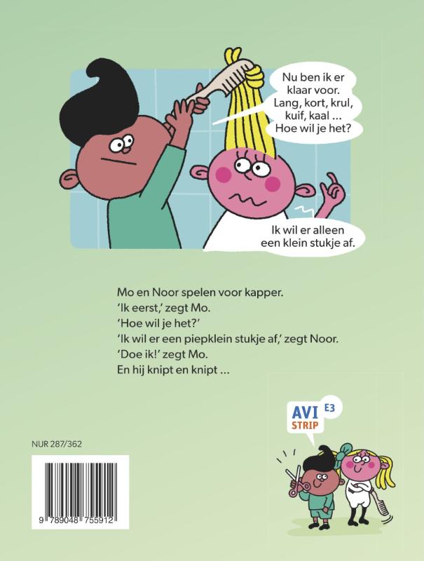 Elkaars haren knippen, dat is leuk. Noor heeft mooie lange haren. Mo begint met knippen. Eerst een klein plukje, maar dan knipt hij verder. Hij houdt maar niet op! Uiteindelijk gaat het helemaal mis. Arme Noor …