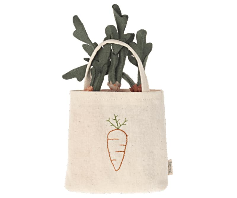 Een leuk boodschappentasje met drie wortels voor je knuffels van het Deense merk Maileg. Ga jij met je knuffels boodschappen doen en wat lekkers klaarmaken en gezellis samen opeten?