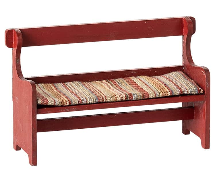 Houten bankje, gemaakt om perfect bij de muizenfamilie te passen. Met een prachtig handgeschilderde vintage uitstraling – variaties kunnen voorkomen – en een zacht kussen bovenop voor extra zitcomfort.