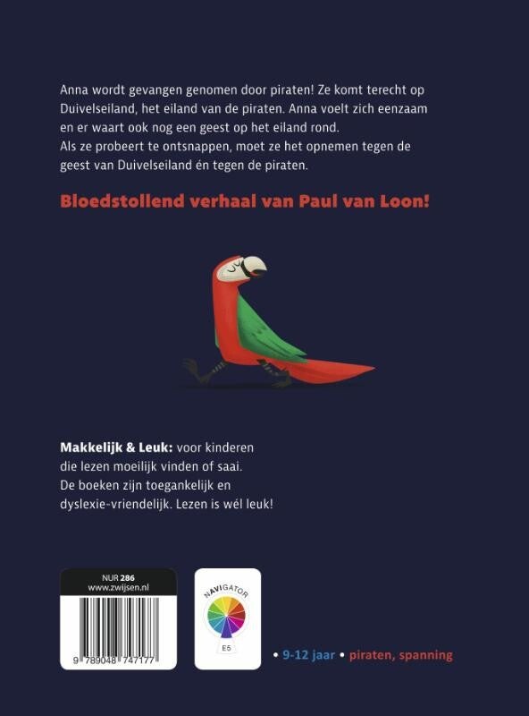 In dit spannende boek probeert Anna te ontsnappen aan piraten én de geest van Duivelseiland. Zal het haar lukken? Het is op AVI E5 en voor kinderen van 9-12 jaar. De serie ‘Makkelijk & Leuk’ is speciaal voor kinderen die lezen moeilijk vinden of saai. Zo krijgen zij weer plezier in lezen. Dyslexievriendelijk!