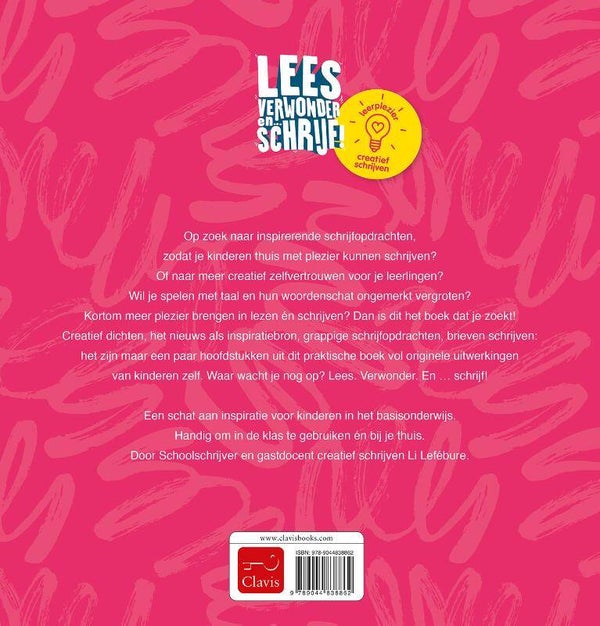 Een schat aan inspiratie voor kinderen in het basisonderwijs. Door Schoolschrijver en gastdocent creatief schrijven Li Lefébure. Op zoek naar inspirerende schrijfopdrachten? Of naar meer creatief zelfvertrouwen voor je leerlingen? Wil je spelen met taal en hun woordenschat ongemerkt vergroten? Kortom meer plezier brengen in lezen én schrijven? Dan is dit het boek dat je zoekt! Creatief dichten, het nieuws als inspiratiebron, grappige schrijfopdrachten, brieven schrijven: het zijn maar een paar hoofdstukken uit dit praktische boek vol originele uitwerkingen van leerlingen zelf. Waar wacht je nog op? Lees. Verwonder. En... Schrijf!