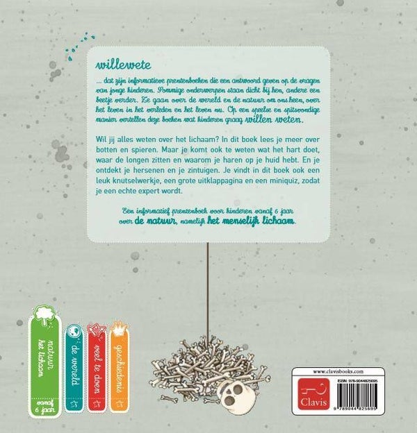 Willewete ... dat zijn informatieve prentenboeken die een antwoord geven op de vragen van jonge kinderen. Sommige onderwerpen staan dicht bij hen, andere een beetje verder. Ze gaan over de wereld en de natuur om ons heen, over het leven in het verleden en het leven nu. Op een speelse en spitsvondige manier vertellen deze boeken wat kinderen graag willen weten. Wil jij alles weten over het lichaam? In dit boek lees je meer over botten en spieren. Maar je komt ook te weten wat het hart doet, waar de longen zitten en waarom je haren op je huid hebt. En je ontdekt je hersenen en je zintuigen. Je vindt in dit boek ook een leuk knutselwerkje, een grote uitklappagina en een miniquiz, zodat je een echte expert wordt. Een informatief prentenboek voor kinderen vanaf 6 jaar over de natuur, namelijk het menselijk lichaam.