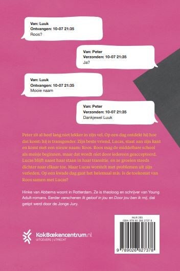 Peter snapt lange tijd niet wat er met hem aan de hand is en waarom hij zo in de war raakt als hij op school bij de jongens wordt ingedeeld. Op een dag ontdekt hij hoe dat komt: hij is transgender. Zijn beste vriend Lucas accepteert het direct en komt met een nieuwe naam: Roos. Na de zomervakantie begint Roos op de middelbare school als meisje, maar dat wordt niet door iedereen geaccepteerd. Gelukkig staat Lucas naast haar bij elke stap die gezet moet worden in de transitie. Roos en Lucas groeien steeds dichter naar elkaar toe, maar Lucas heeft zelf ook zijn eigen problemen en moet dealen met zijn verleden. Op een kwade dag gaat het helemaal mis. Is de toekomst van Roos samen met Lucas?