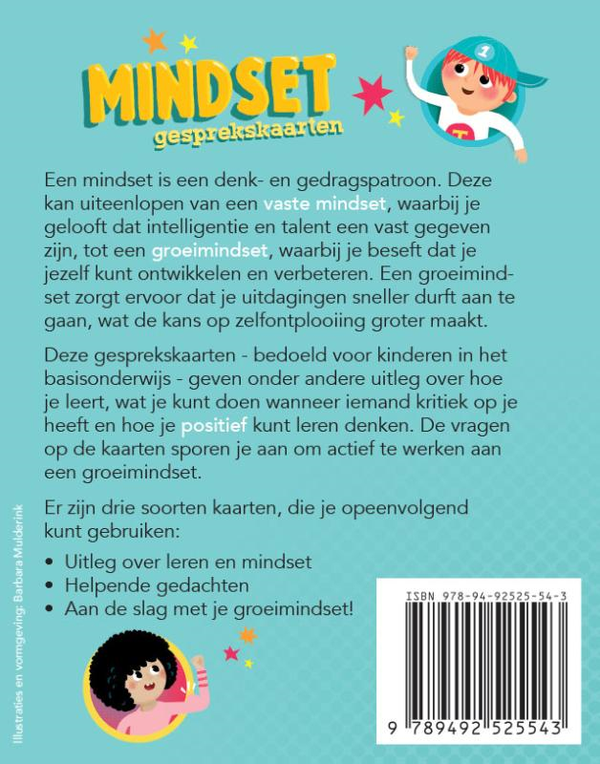Een mindset is een denk- en gedragspatroon. Deze kan uiteenlopen van een vaste mindset, waarbij je gelooft dat intelligentie en talent een vast gegeven zijn, tot een groeimindset, waarbij je beseft dat je jezelf kunt ontwikkelen en verbeteren. Een groeimindset zorgt ervoor dat je uitdagingen sneller durft aan te gaan, wat de kans op zelfontplooiing groter maakt. Deze gesprekskaarten - bedoeld voor kinderen in het basisonderwijs - geven onder andere uitleg over hoe je leert, wat je kunt doen wanneer iemand kritiek op je heeft en hoe je positief kunt leren denken. De vragen op de kaarten sporen je aan om actief te werken aan een groeimindset. Er zijn drie soorten kaarten, die je opeenvolgend kunt gebruiken: • Uitleg over leren en mindset • Helpende gedachten • Aan de slag met je groeimindset!