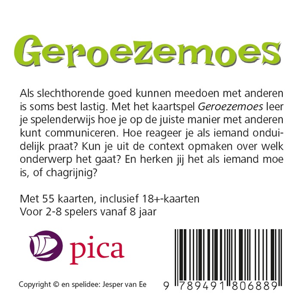 Met het kaartspel Geroezemoes leren kinderen hoe zij op de juiste manier met anderen kunnen communiceren. Het doel van het spel is om zoveel mogelijk kaartjes te verzamelen. Je krijgt een kaartje als je op de juiste manier om herhaling vraagt, als je uit de context weet te achterhalen over welk onderwerp het gaat of als je weet welke emotie iemand toont.