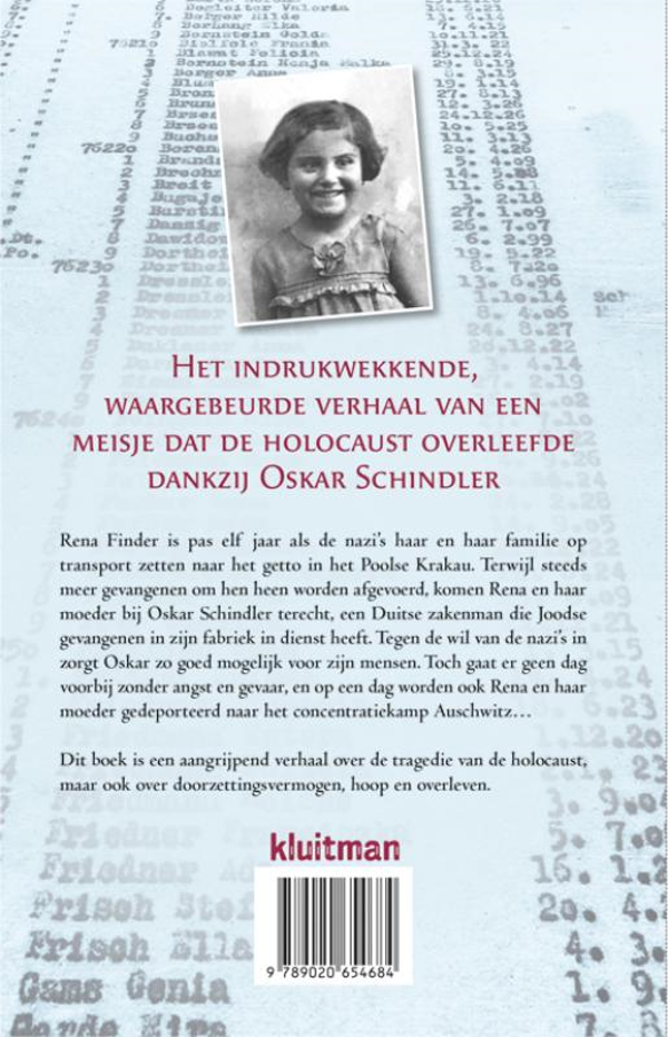 Rena Finder is pas elf jaar als de nazi’s haar en haar familie op transport zetten naar het getto in het Poolse Krakau. Terwijl steeds meer gevangenen om hen heen worden afgevoerd, komen Rena en haar moeder bij Oskar Schindler terecht, een Duitse zakenman die Joodse gevangenen in zijn fabriek in dienst heeft. Tegen de wil van de nazi’s in zorgt Oskar zo goed mogelijk voor zijn mensen. Toch gaat er geen dag voorbij zonder angst en gevaar, en op een dag worden ook Rena en haar moeder gedeporteerd naar het concentratiekamp Auschwitz… Dit boek is het aangrijpende verhaal over de tragedie van de holocaust, maar ook over doorzettingsvermogen, hoop en overleven.