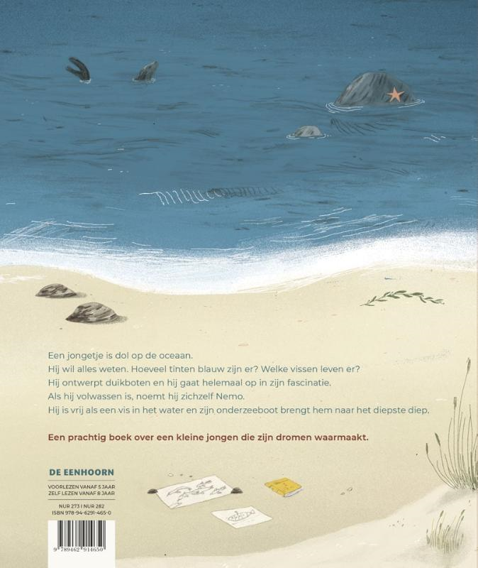 Over opgroeien en je dromen waarmaken - Schitterende onderwater-illustraties - Met een knipoog naar Twintigduizend mijlen onder zee van Jules Vernes Wie was kapitein Nemo voor hij kapitein Nemo werd? Ken je de stilste plek van de hele wereld? Een plek waar je zelfs de wind niet hoort ruisen? Jacob droomt over vissen, water en de oceaan. Hij wenst wilde wateravonturen en wil tussen de vissen kunnen zwemmen. Wat in zijn hoofd zit, moet echt worden. Hij bouwt een grote onderwaterboot: de Nautilus. Zo wordt hij kapitein Nemo. Kom je kijken?