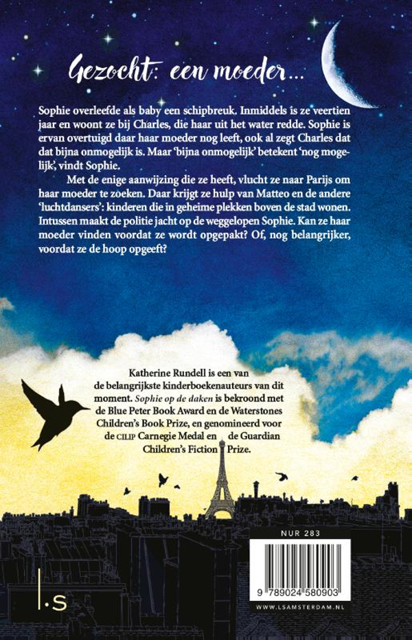 Katherine Rundell, bekend van Feo en de wolven en De ontdekkingsreiziger, vertelt in Sophie op de daken een meeslepend verhaal over familie en doorzettingsvermogen. Opnieuw een schitterende jeugdroman van een van de belangrijkste Britse kinderboekenauteurs van dit moment. Sophie overleefde als baby een schipbreuk en iedereen denkt dat ze wees is. Maar Sophie herinnert zich nog dat haar moeder om hulp zwaaide toen Sophie in een cellokist in het Kanaal dreef. Volgens haar voogd is het bijna onmogelijk dat haar moeder nog leeft. Maar ‘bijna onmogelijk’ betekent ‘nog mogelijk’, vindt Sophie. Met de enige aanwijzing die ze heeft – het adres van de cellomaker – vlucht Sophie naar Parijs. Daar krijgt ze hulp van Matteo en zijn ‘daklopers’, die in geheime plekken boven de stad wonen. Maar kunnen ze haar moeder vinden voordat Sophie wordt opgepakt door de autoriteiten? Of, nog belangrijker, voordat ze de hoop opgeeft? Katherine Rundells boeken zijn bekroond met grote literaire prijzen, waaronder de Blue Peter Award, Costa Book Award en Waterstones Children’s Book Prize.