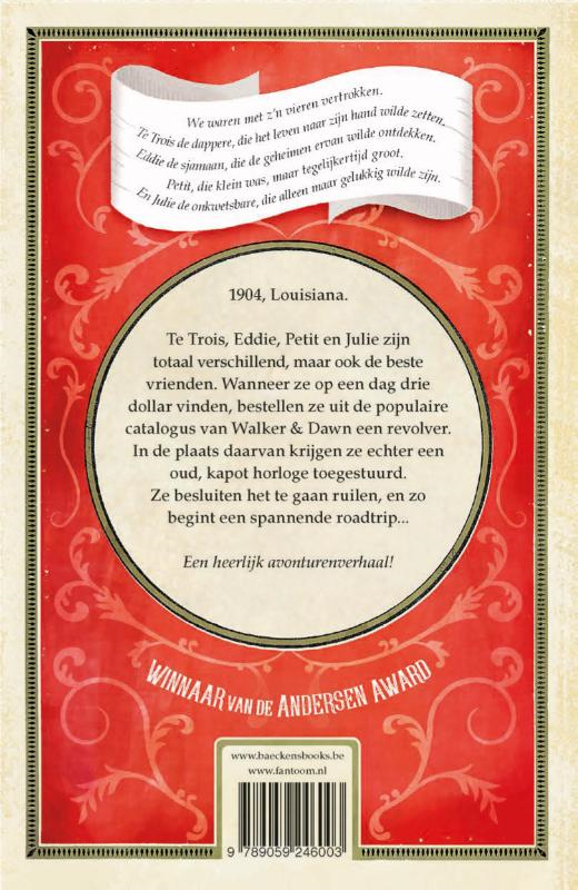 We waren met z’n vieren vertrokken. Te Trois de dappere, die alles uit het leven wilde halen. Eddie de sjamaan, die de geheimen ervan wilde ontdekken. Petit, die klein was, maar groot wanneer nodig. En Julie de onkwetsbare, die gewoon gelukkig wilde zijn. Te Trois, Eddie, Petit en Julie zijn totaal verschillend, maar ook de beste vrienden. Wat ze gemeenschappelijk hebben, is een catalogus van een postorderbedrijf, drie dollar om te besteden én heel veel zin om de wereld te ontdekken. Wanneer ze in plaats van de revolver die ze hebben besteld een oud, kapot horloge ontvangen, hoeven ze er geen twee keer over na te denken; ze gaan op weg naar Chicago om het te ruilen. Ze reizen met een goederentrein, en met een stoomboot over de Mississippi, krijgen te maken met een lijk in drijfzand, professionele oplichters en valsspelers, corrupte politieagenten, slechteriken die goed lijken en goede mensen die dat helemaal niet zijn... om nog maar te zwijgen van een onopgeloste misdaad en een heleboel geld!
