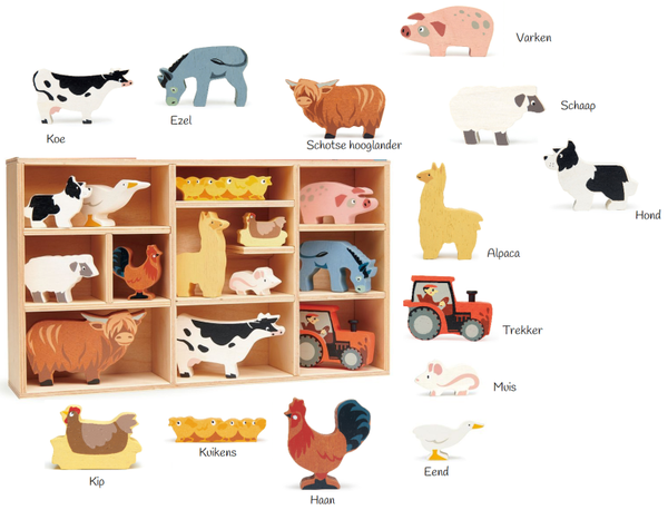 Deze prachtige houten boerderijdieren zijn gemaakt van massief rubberhout en geverfd in een zachte waterkleurbeits. Ze zijn met de hand afgewerkt om het een unieke uitstraling te geven!