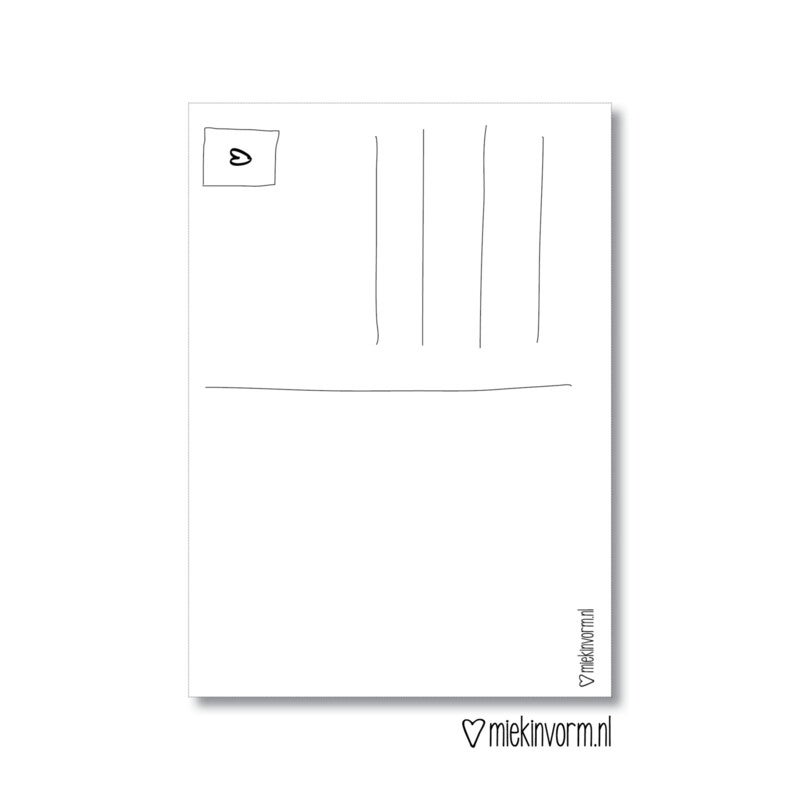 De kaart is A6-formaat en is geprint op stevig kaartpapier met een ruwe matte uitstraling. Op de achterzijde is ruimte voor een adres en een persoonlijke boodschap.
