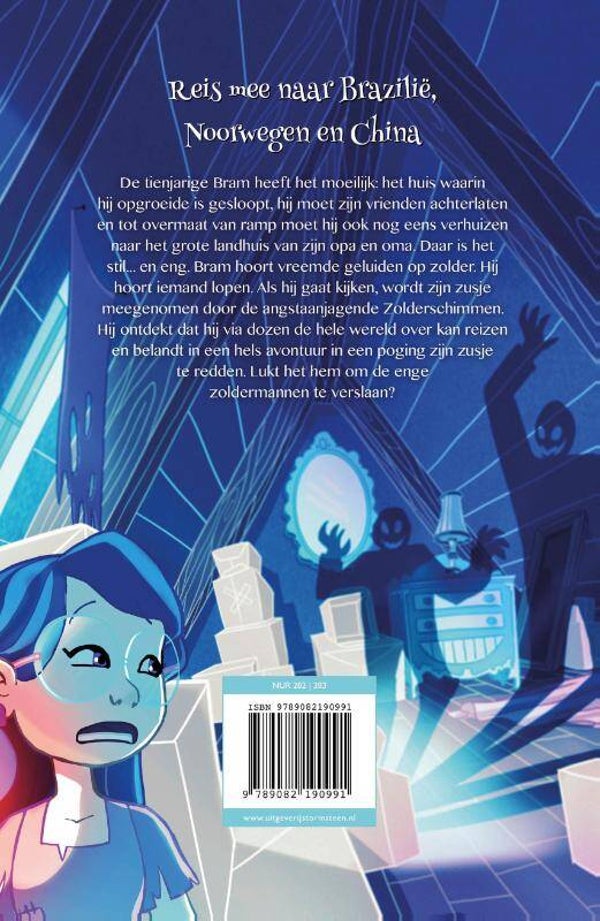 De tienjarige Bram heeft het moeilijk: het huis waarin hij opgroeide is gesloopt, hij moet zijn vrienden achterlaten en tot overmaat van ramp moet hij ook nog eens verhuizen naar het grote landhuis van zijn opa en oma. Daar is het stil... en eng. Bram hoort vreemde geluiden op zolder. Hij hoort iemand lopen. Als hij gaat kijken, wordt zijn zusje meegenomen door de angstaanjagende Zolderschimmen. Hij ontdekt dat hij via dozen de hele wereld over kan reizen en belandt in een hels avontuur in een poging zijn zusje te redden. Lukt het hem om de enge zoldermannen te verslaan?