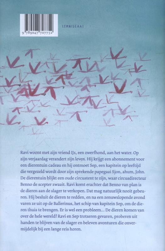 Ravi woont met zijn vriend IJs, een zwerfhond, aan het water. Op zijn verjaardag verandert zijn leven. Hij krijgt een abonnement voor een dierentuin cadeau en hij ontmoet Sep, een kapitein op leeftijd die vergezeld wordt door zijn sprekende papegaai Sjon, ahum, John. De dierentuin blijkt een oude circustent te zijn, waar circusdirecteur Benno de scepter zwaait. Ravi komt er achter dat Benno van plan is de dieren aan de slager te verkopen. Dat mag natuurlijk nooit gebeuren. Hij besluit de dieren te redden, en na een zenuwslopende avond varen ze uit op de Ballerinus, het schip van kapitein Sep, om de dieren thuis te brengen. Er is wel een probleem... De dieren komen van over de hele wereld! Ravi en Sep trotseren gevaren, proberen uit handen te blijven van de slager en beleven avonturen die onvermijdelijk bij een lange reis horen. Arienne Bolt was docent tot ze stopte met lesgeven om dit boek te schrijven. Voor haar is geluk: 'Even vertoeven in een andere wereld.' In haar boeken schept ze nu zelf die andere werelden. De laatste reis van de Ballerinus is haar debuut. Linde Faas studeerde cum laude af aan de kunstacademie van Breda. Ze werkt als animator van tekenfilms, als kunstenares en illustrator. Voor Lemniscaat illustreerde ze prentenboeken, de verhalen van Pieter Koolwijk over Vlo en Stiekel en Colafonteinen en spetterende verfbommen van Jesse Goossens. WWW.LINDEFAAS.NL