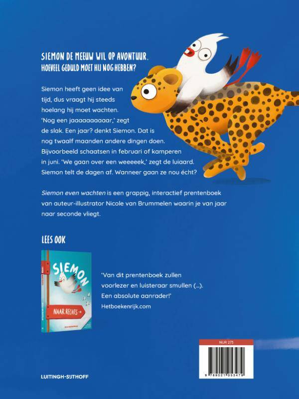 Na Siemon naar rechts van Nicole van Brummelen beleeft Siemon de meeuw een nieuw avontuur. Blader met hem mee van jaar naar seconde in dit interactieve prentenboek waarin kinderen leren omgaan met tijd - en even moeten wachten!