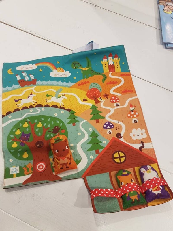 Het sprookjes speelkleed is handgemaakt, compact en draagbaar met 3 figuurtjes, gemakkelijk opgerold en zo opengevouwen, klaar om te spelen.