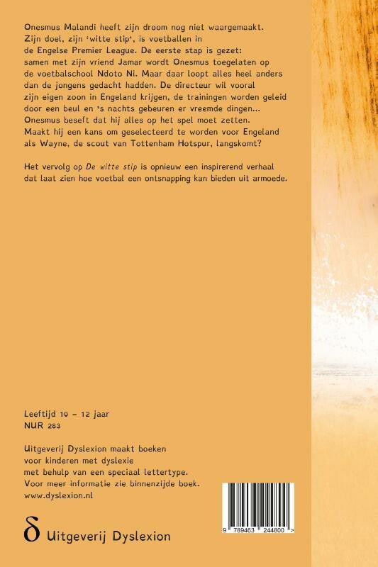 Onesmus Malandi heeft zijn droom nog niet waargemaakt. Zijn doel, zijn ‘witte stip’, is voetballen in de Engelse Premier League. De eerste stap is gezet: samen met zijn vriend Jamar wordt Onesmus toegelaten op de voetbalschool Ndoto Ni. Maar daar loopt alles heel anders dan de jongens gedacht hadden. De directeur wil vooral zijn eigen zoon in Engeland krijgen, de trainingen worden geleid door een beul en ’s nachts gebeuren er vreemde dingen… Onesmus beseft dat hij alles op het spel moet zetten. Maakt hij een kans om geselecteerd te worden voor Engeland als Wayne, de scout van Tottenham Hotspur, langskomt? Het vervolg op De witte stip is opnieuw een inspirerend verhaal dat laat zien hoe voetbal een ontsnapping kan bieden uit armoede.