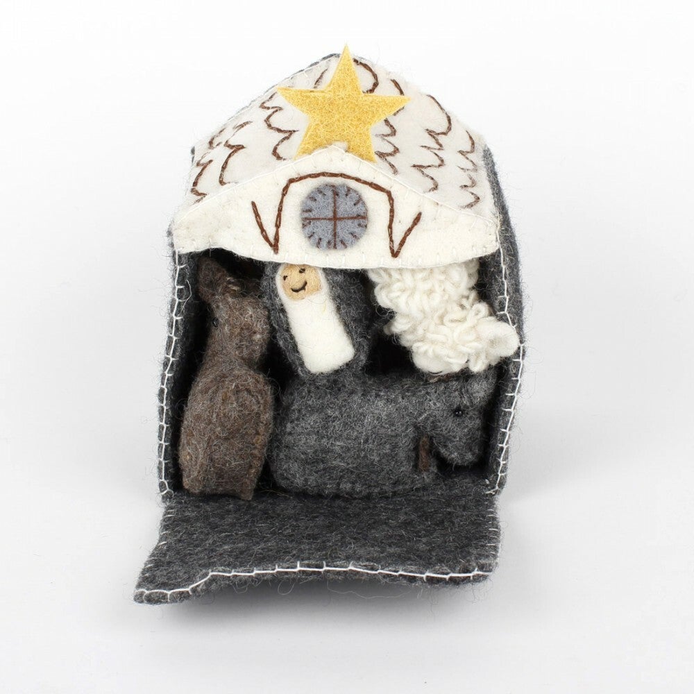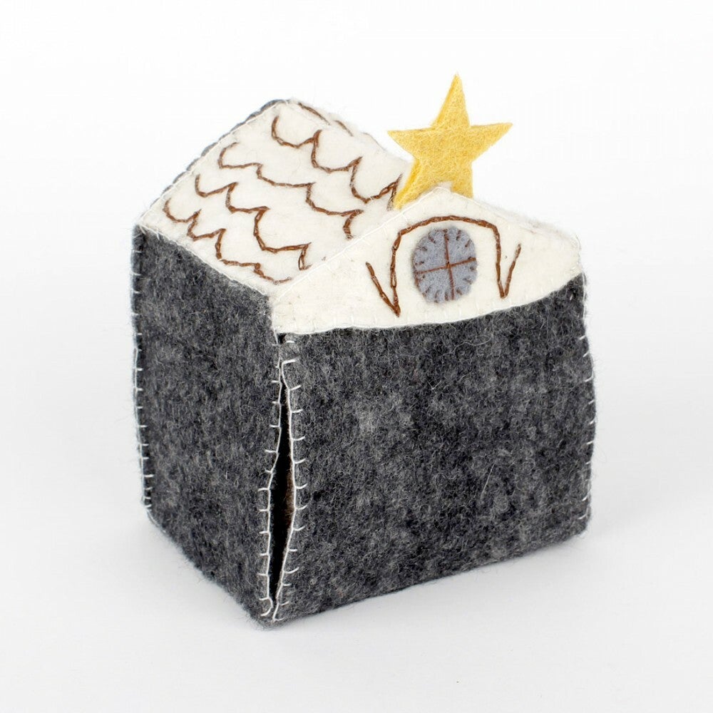 Vilten kerststal. De kerstfiguren passen allemaal in het hutje van vilt (afmetingen 15 x 13 x 11 cm), waardoor het geheel zeer compact op te bergen is! Het pakket bevat de volgende kerstfiguren: Jezus, Maria, Jozef, de Drie Koningen, een engel, de herder, een os, een ezel en een schaap.