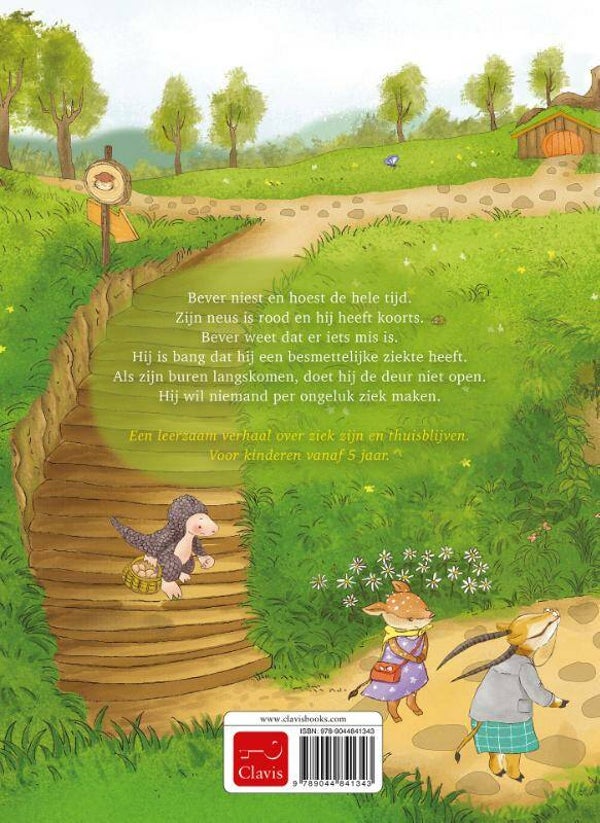 Een leerzaam verhaal over ziek zijn en thuisblijven. Voor kinderen vanaf 5 jaar. Bever niest en hoest de hele tijd. Zijn neus is rood en hij heeft koorts. Bever weet dat er iets mis is. Hij is bang dat hij een besmettelijke ziekte heeft. Als zijn buren langskomen, doet hij de deur niet open. Hij wil niemand per ongeluk ziek maken.