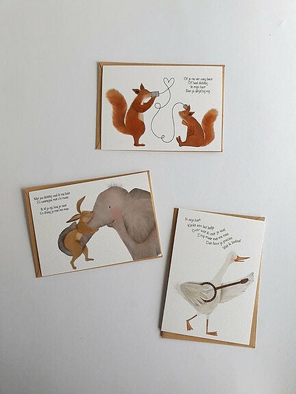 De kaart heeft een A6 formaat. Tekst door Joanneke Wiersma. De illustraties zijn handgemaakt door Rixt-Marieke.
