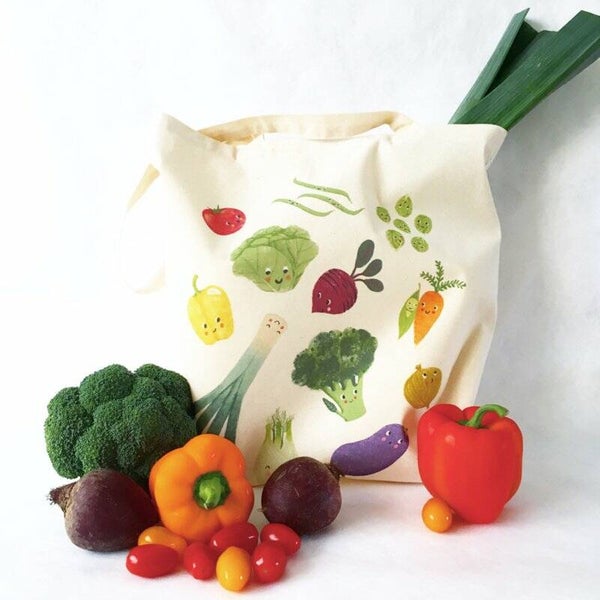 Groenten halen op de markt? Dat doe je niet meer met zo’n plastic zakje van de marktkraam maar met deze duurzame tas van biologische katoen met de Happy Veggies.