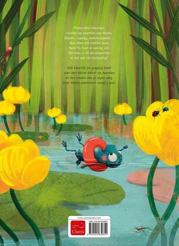 Een kleurrijk en grappig boek over een kleine kikker op zwemles en het vinden van je eigen weg. Voor kleine zwemmers vanaf 4 jaar. Plons! Alle kikkertjes moeten op zwemles van Mama. Drijven, rugslag, watertrappelen … Hop doet zijn vrolijke best, maar hij bakt er weinig van. Eén keer is hij de dapperste. Is dat wel zijn bedoeling?