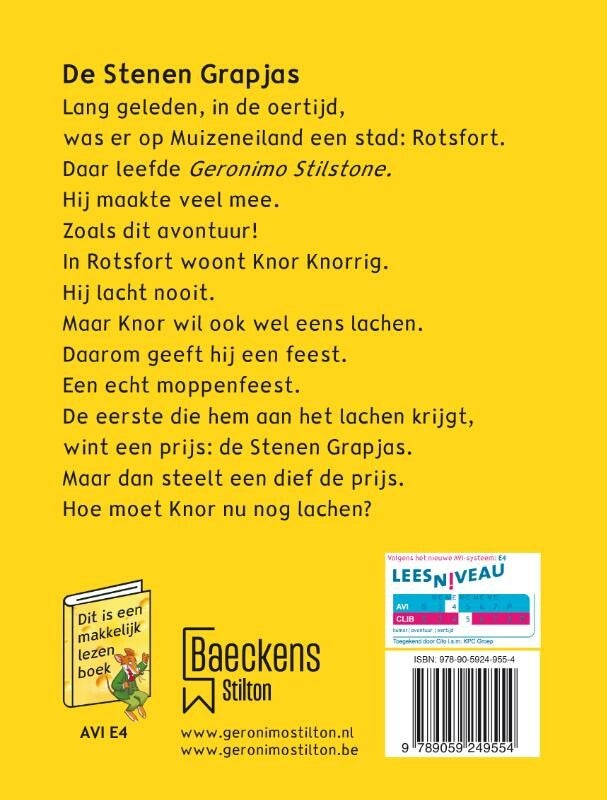Knor Knorrig is de meest knorrige oerknager van heel Rotsfort. Hij lacht nooit! Maar dan bedenkt hij dat hij ook weleens wil lachen, en organiseert hij een heus moppenfeest. Voor de knager die hem het eerst aan het lachen krijgt, heeft hij een prachtige beker laten maken: De Stenen Grapjas, ontworpen door een beroemde kunstenaar. Het is zo’n mooie prijs dat zelfs de beroemdste grappenmakers van de hele oertijd meedoen! Dan wordt de beker ineens gestolen, en kan er helemaal niemand meer lachen… Wat nu?
