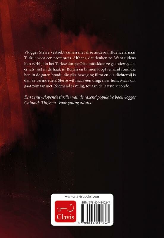 Een zenuwslopende thriller van de razend populaire bookvlogger Chinouk Thijssen. Voor young adults. Vlogger Sterre vertrekt samen met drie andere influencers naar Turkije voor een promoreis. Althans, dat denken ze. Want tijdens hun verblijf in het Turkse dorpje Oba ontdekken ze gaandeweg dat er iets niet in de haak is. Buiten en binnen loopt iemand rond die hen in de gaten houdt, die elke beweging filmt en die dichterbij is dan ze vermoeden. Sterre wil maar één ding: naar huis. Maar dat gaat zomaar niet. Niemand is veilig, tot aan de laatste seconde.