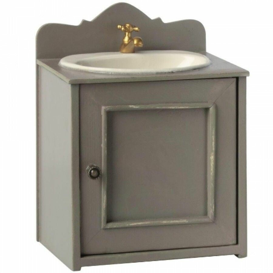 Deze miniatuur badmeubeltje maakt jouw Maileg badkamer helemaal af! Een mooie vintage metalen wasbak met een gouden waterkraan. De wasbak wordt geleverd in een houten kast die voorzien is van een oude vintage look.