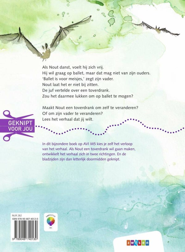 In dit bijzondere boek op AVI M5 kiest de lezer zelf de afloop van het verhaal. Het verhaal is letterlijk doormidden geknipt. Nout wil graag op ballet, maar dat mag niet van zijn ouders. De juf vertelde over een toverdrank. Zou het daarmee lukken om op ballet te mogen? Nout wil een toverdrank gaan maken. Vanaf dit punt in het boek zijn de pagina’s doormidden geknipt en ontwikkelt het verhaal zich in twee richtingen. In het bovenste verhaal gaat Nout op zoek naar ingrediënten voor een toverdrank om zelf te veranderen. En in het onderste verhaal probeert Nout zijn vader te veranderen met een toverdrank. Welk verhaal je ook leest, dit boek is geknipt voor jou!