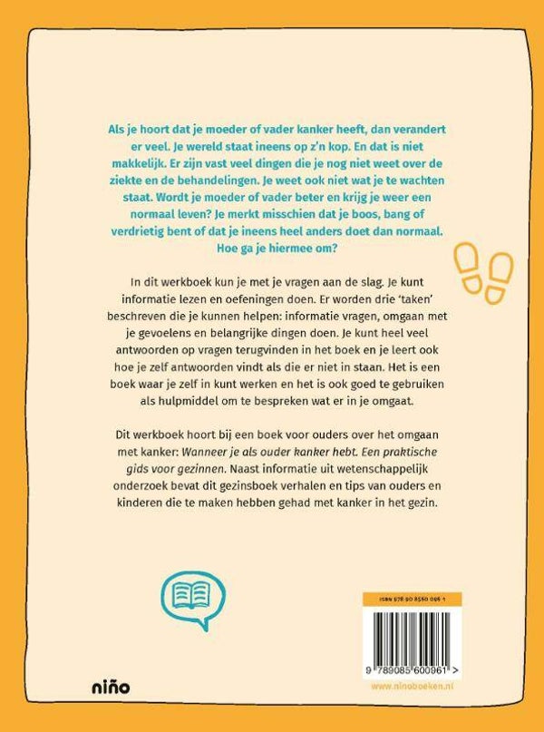 Als je hoort dat je moeder of vader kanker heeft, dan verandert er veel. Je wereld staat ineens op z’n kop. En dat is niet makkelijk. Er zijn vast veel dingen die je nog niet weet over de ziekte en de behandelingen. Je weet ook niet wat je te wachten staat. Wordt je moeder of vader beter en krijg je weer een normaal leven? Je merkt misschien dat je boos, bang of verdrietig bent of dat je ineens heel anders doet dan normaal. Hoe ga je hiermee om? In dit werkboek kun je met je vragen aan de slag. Je kunt informatie lezen en oefeningen doen. Er worden drie ‘taken’ beschreven die je kunnen helpen: informatie vragen, omgaan met je gevoelens en belangrijke dingen doen. Je kunt heel veel antwoorden op vragen terugvinden in het boek en je leert ook hoe je zelf antwoorden vindt als die er niet in staan. Het is een boek waar je zelf in kunt werken en het is ook goed te gebruiken als hulpmiddel om te bespreken wat er in je omgaat. Dit werkboek hoort bij een boek voor ouders over het omgaan met kanker: Wanneer je als ouder kanker hebt. Een praktische gids voor gezinnen. Naast informatie uit wetenschappelijk onderzoek bevat dit gezinsboek verhalen en tips van ouders en kinderen die te maken hebben gehad met kanker in het gezin.