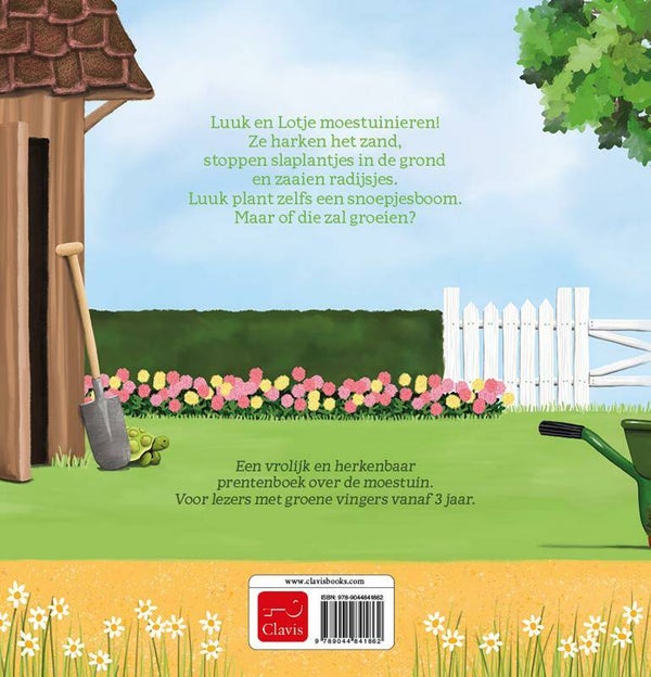 Een vrolijk en herkenbaar prentenboek over de moestuin. Voor lezers met groene vingers vanaf 3 jaar. Luuk en Lotje moestuinieren! Ze harken het zand, stoppen slaplantjes in de grond en zaaien radijsjes. Luuk plant zelfs een snoepjesboom. Maar of die zal groeien?