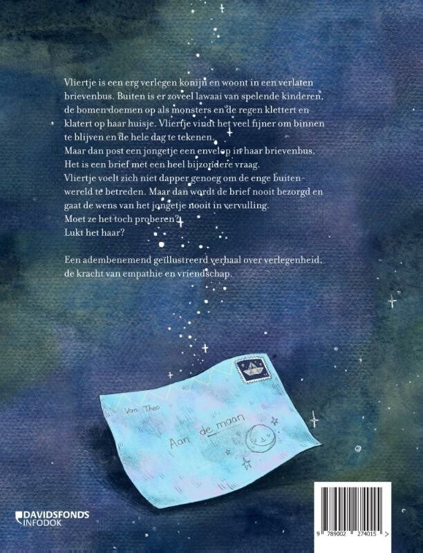 Vliertje is een erg verlegen konijn en woont in een verlaten brievenbus. Buiten is er zoveel lawaai van spelende kinderen, de bomen doemen op als monsters en de regen klettert en klatert op haar huisje. Vliertje vindt het veel fijner om binnen te blijven en de hele dag te tekenen. Maar dan post een jongetje een envelop in haar brievenbus. Het is een brief met een heel bijzondere vraag. Vliertje voelt zich niet dapper genoeg om de enge buitenwereld te betreden. Maar dan wordt de brief nooit bezorgd en gaat de wens van het jongetje nooit in vervulling. Moet ze het toch proberen? Lukt het haar? Een adembenemend geïllustreerd verhaal over verlegenheid, de kracht van empathie en vriendschap.