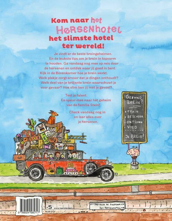 Na het succesvolle Pretpark de Poepfabriek over je darmen is er nu Het Hersenhotel. In dit boek nemen auteurs Marja Baseler en Annemarie van den Brink je mee op reis naar de binnenkant van je hoofd en ontdek je wat jouw talenten zijn. Met paginagrote illustraties van Tjarko van der Pol. Je brein is een supermachine. Het regelt alles wat er in je lichaam gebeurt. Dat je ademt en je hart klopt. Dat je kunt praten, lopen, horen en zien. Maar je brein regelt veel meer! Heb je bijvoorbeeld aanleg voor voetballen of muziek maken? Ben je goed in taal of rekenen? Heb je veel fantasie of kun je heel goed samenwerken? Het zit allemaal in je brein! Check vandaag nog in het Hersenhotel in en ontdek waar jij goed in bent. Met een stappenplan om je brein gezond te houden, een spannende speurtocht, een talententest en heel veel grappige en interessante weetjes! ‘Een kijkje in ons binnenste, op een grappige en toegankelijke manier.’ AD over Pretpark de Poepfabriek