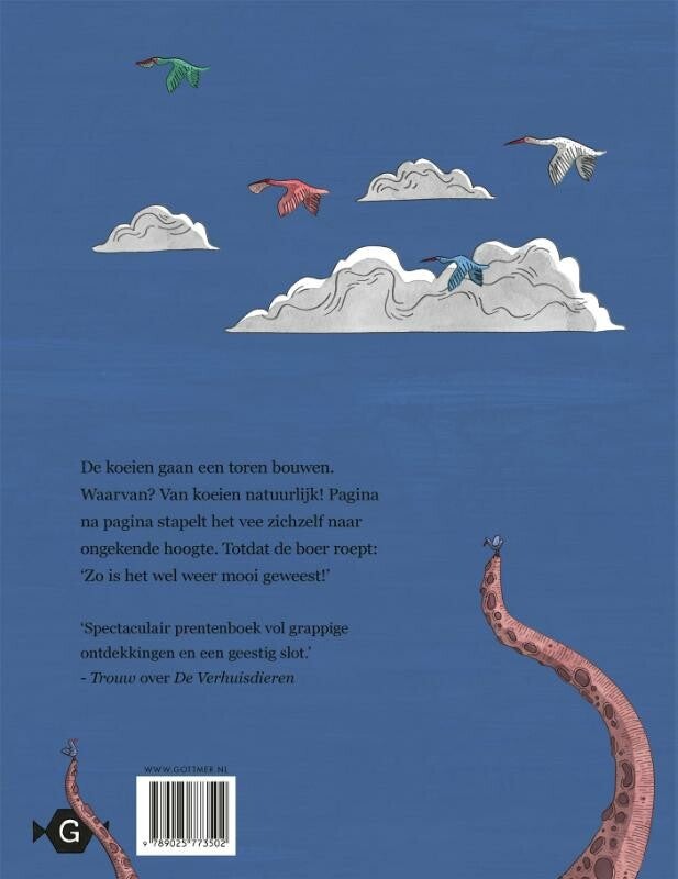 en toren van koe’ is het nieuwe prentenboek van ‘De verhuisdieren’-auteur Pieter van den Heuvel. In De ‘Verhuisdieren’ bleek al het enorme gevoel voor humor van Pieter van den Heuvel. Ook ‘Een toren van koe’ is een hilarisch boek op rijm om keer op keer voor te lezen. De koeien gaan een toren bouwen en de hele wei helpt mee. En waarvan wordt die toren gemaakt? Van de koeien zelf! Alle koeien op de boerderij klimmen op elkaar. De toren wordt al snel heel hoog. Koeien worden omhoog getakeld of beginnen een lange klim. Sommige worden met raketten naar boven gebracht en misschien komt de zeekoe zelfs wel even helpen. Vliegtuigen suizen langs. En dan… begint de laatste koe te zweven. ‘Zo is het wel mooi geweest,’ roept de boer. De koeien klimmen naar beneden. Behalve die laatste dan natuurlijk. De gedetailleerde illustraties van Pieter van den Heuvel staan garant voor urenlang kijkplezier. Hoe langer je kijkt, hoe meer grappige details je opvallen. Hierdoor zullen kinderen dit boek keer op keer willen bekijken. 'Een boek vol vrolijke gekte voor urenlang kijkplezier.' – Trouw 'Kolderiek kijkboek met veel grappige details.' – Ouders van Nu 'Heerlijk onverstoorbaar absurdisme' - NRC