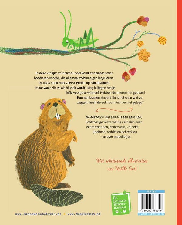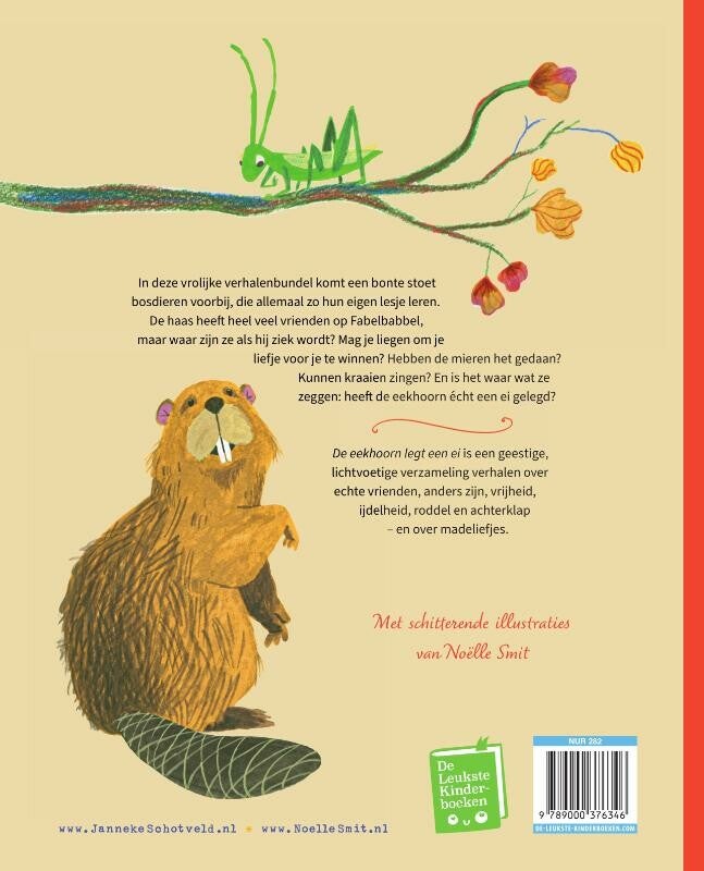 De eekhoorn legt een ei is een geestige, lichtvoetige verzameling verhalen over echte vrienden, over anders-zijn, vrijheid, ijdelheid, roddel en achterklap en over madeliefjes. Met schitterende illustraties van Noëlle Smit.