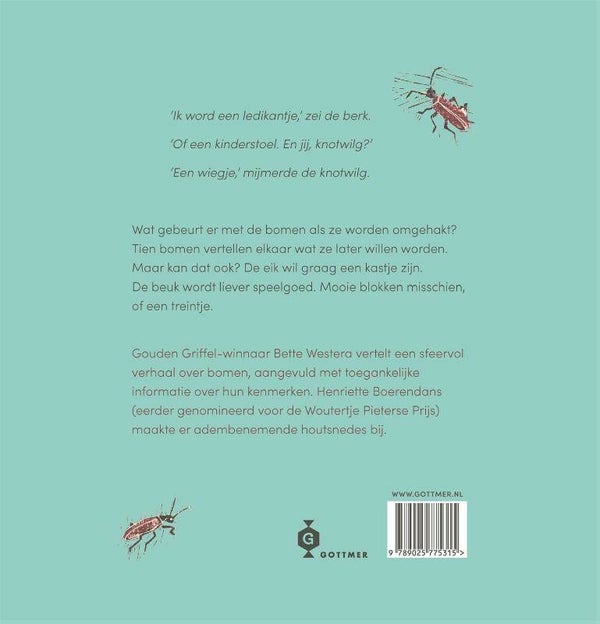 ‘Ik wil een wiegje worden, zei de wilg’ is een prachtige samenwerking tussen prijswinnend auteur Bette Westera en topillustrator Henriette Boerendans. Eerder maakten zij samen het indrukwekkende alfabetboek ‘Aap Beer Zebra’ (genomineerd voor Woutertje Pieterse Prijs). ‘Ik wil een wiegje worden, zei de wilg’ gaat over de warme, hoopvolle en soms eigenwijze overpeinzingen van de bomen. Wat gebeurt er met de bomen als ze straks omgehakt worden? De eik wil graag een eikenhouten kastje zijn. Dat wil de beuk eigenlijk ook wel. Maar dat kan niet, want hij is een beuk. Een beukenhouten tafel kan wel, maar dat wil hij niet. Dan gaat iedereen maar aan hem zitten. Nee, dan is hij liever speelgoed. Mooie blokken voor hoge torens, misschien. Met behulp van houtsneden maakte Henriette Boerendans ambachtelijke en sprekende illustraties bij de tekst van Bette Westera.