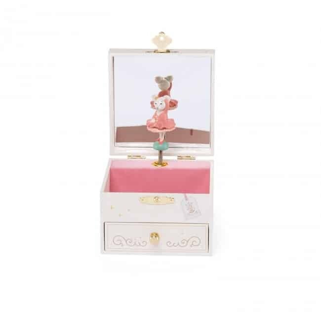 Een geïllustreerde muziekdoos met een kleine lade om je kostbare geheimen in op te bergen… Open de doos en kijk hoe de mooie kleine dansende muis ronddraait op een zachte melodie… Er is zelfs een spiegel om jezelf te bewonderen.